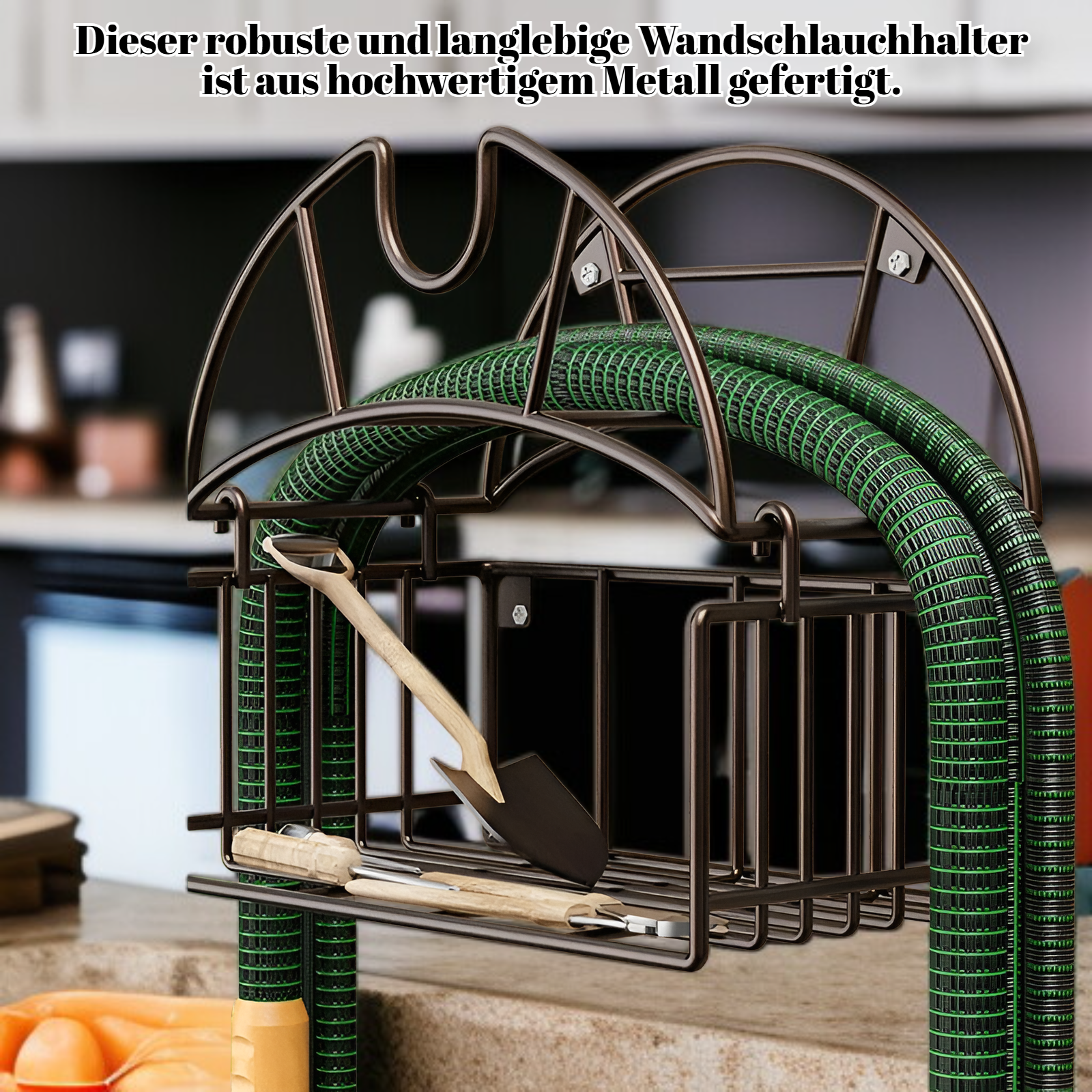 ● Robuster Wand-Schlauchhalter aus hochwertigem Metall, sorgt für eine zuverlässige und langlebige Aufbewahrung Ihres Gartenschlauchs ohne Verformungen.